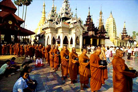 ● 早餐后前往参观【马哈伽纳扬僧院/千人僧饭】。马哈伽纳扬僧院是全缅甸最大的僧院。这里犹如一所僧人大学,学生人数接近 2000 人。每天上午 10 点,各国游客云集至此,目睹千名和尚一同用午餐的画面,冲击震撼。缅甸僧侣一天只吃 2 餐,一餐在清晨 4 点钟,一餐在上午 10 点钟,过午不食,只能喝水。至于和尚们的伙食,荤素都有,鸡鸭鱼肉、水果蔬菜、茶水饮料一样不少。因为缅甸的僧人可以吃荤,一般情况下,化缘得到什么就吃什么。