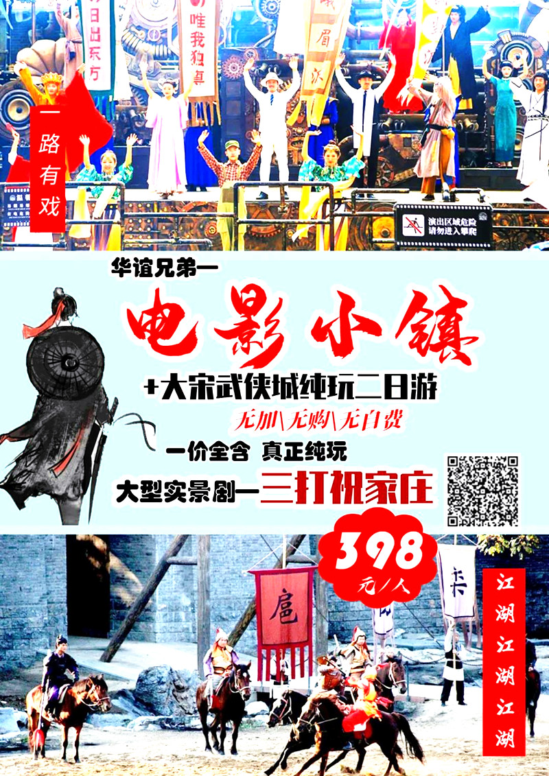 早指定地点时间赴河南郑州游览【建业·华谊兄弟电影小镇】, 其是建业集团联手华谊兄弟共同开发的以“电影”为主题的文化旅游小镇。项目定位为沉浸式电影潮玩地,以电影场景为形、以历史文化和城市记忆为魂,集电影场景游览、电影文化展示、电影互动游乐、民俗和非遗体验、大型系列演出、特色餐饮、主题客栈等于一体。游览结束入住酒店休息。 |